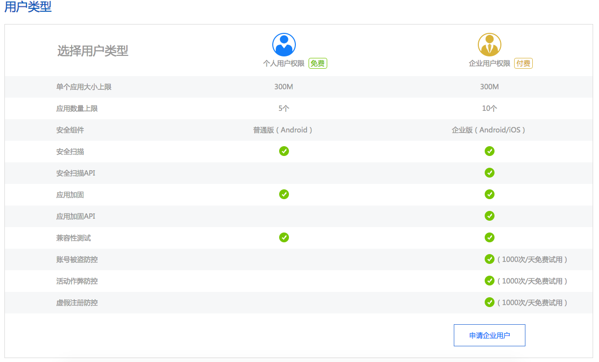 阿里聚安全在免费漏洞扫描中推广安全组件服务,并且对功能分级针对企业版收费。它的收费是通过用户类型来区分,个人用户可以免费试用漏洞扫描,而企业用户则开通了全部权限同时也提供API服务。不过具体收费方式在官网中没有找到。