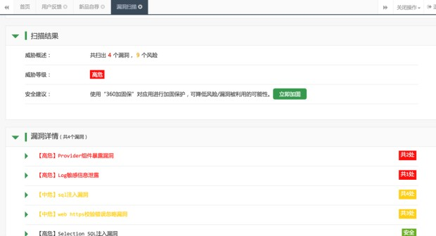 360本身漏洞扫描也是不收费的,在扫描报告中会通过安全建议“使用360加固对应用进行加固保护”来推广加固服务。