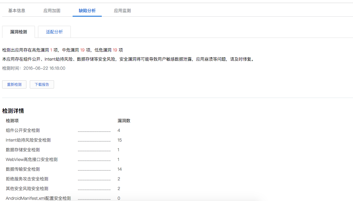 腾讯云的应用乐固在扫描界面中无法在线查看扫描的详情数据,只有通过下载报告才可以。检测项主要有分以下8种“组件公开安全检测”、“intent劫持风险安全检测”、“数据存储安全检测”、“webview高危接口安全检测”、“数据传输安全检测”、“拒绝服务攻击安全检测”、“其他安全风险检测”、“AndroidManifest.xml配置安全检测”。从整体几个功能的信息像详细度来看主要也是推广加固的。