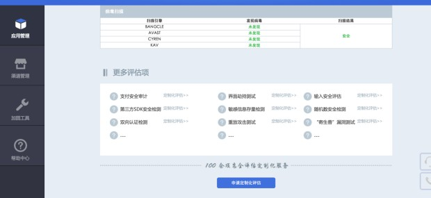 作为最老牌的应用安全厂商,梆梆的商业模式主要是利用线上的自动化扫描来退出他们的人工审计服务。在扫描报告的下方有更多评估项,例如“支付安全审计”、“界面劫持测试”、“输入安全评估”等定制化服务。点击“申请定制化评估”后,是一个对话窗口,可以通过窗口和客服交流。了解到这部分定制化的服务是通过线下的方式来对接的。和上面百度阿里的几款自主化产品服务形式相比,耗费在人工对接上的时间精力可能会比较大。