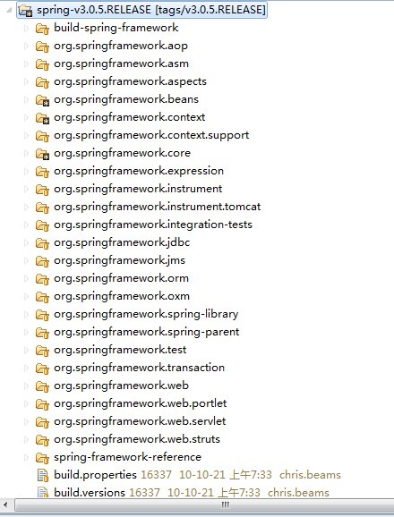 4.从 https://github.com/SpringSource/spring-framework 该地址中检出spring的源码,推荐版本spring-v3.0.5.RELEASE。