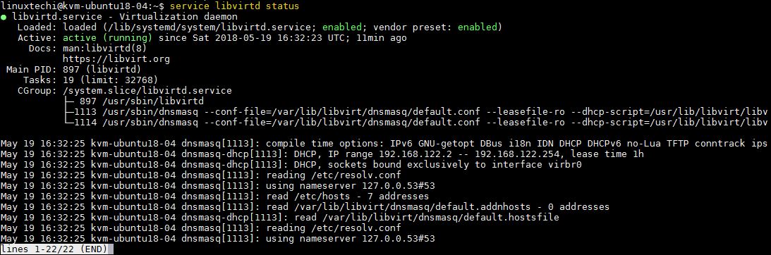 linuxtechi@kvm-ubuntu18-04:~$ sudo service libvirtd start linuxtechi@kvm-ubuntu18-04:~$ sudo update-rc.d libvirtd enable