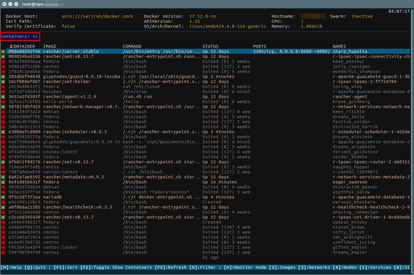 按下 F2 键即可列出列出全部容器,包括运行中和已关闭的容器。