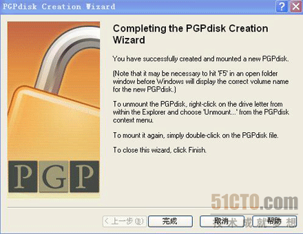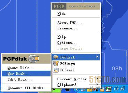[url]http://www.pgp.com/downloads/[/url]先安装PGP,安装过程比较简单,可以参考51CTO有关PGP技术专题上的相关文章,这里就不再说明了!安装完软件后,先用PGPkeys通过PGP Key Generation wizard生成邮件地址对应的公钥和私钥。(记住这个私钥,以后打开PGP邮件相关的信息时,都需要输入此私钥)以下正试进行PGP磁盘加密的操作:1.通过右击PGP的托盘,选择PGPdisk中的New Disk操作项,如下图: