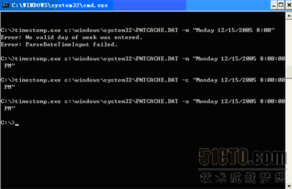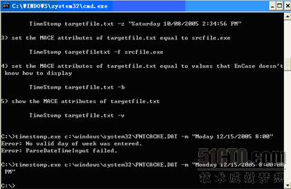 ◆使用命令“timestomp targetfile.txt –m“ Monday 12/15/2005 8:00:00 PM””的操作,修改最后修改的时间信息。如下图所示: