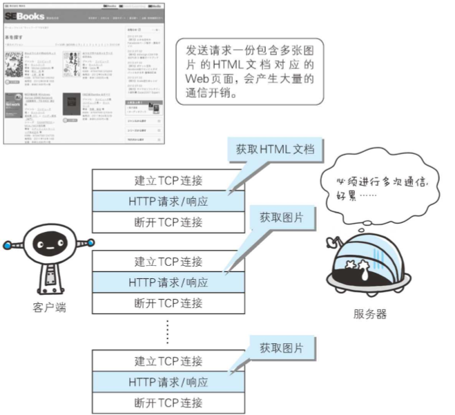 HTTP协议的初始版本中,每进行一次HTTP通信就要断开一次TCP连接。以当年的通信情况来说,因为都是些容量很小的文本传输,所以即使这样也没有多大问题。可随着 HTTP 的 普及,文档中包含大量图片的情况多了起来。比如,使用浏览器浏览一个包含多张图片的 HTML 页面时,在发送请求访问 HTML 页面资源的同时,也会请 求该 HTML 页面里包含的其他资源。因此,每次的请求都会造成无谓的 TCP 连接建立和断开,增加通信量的 开销。