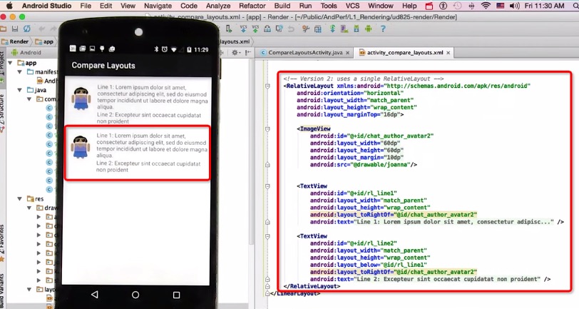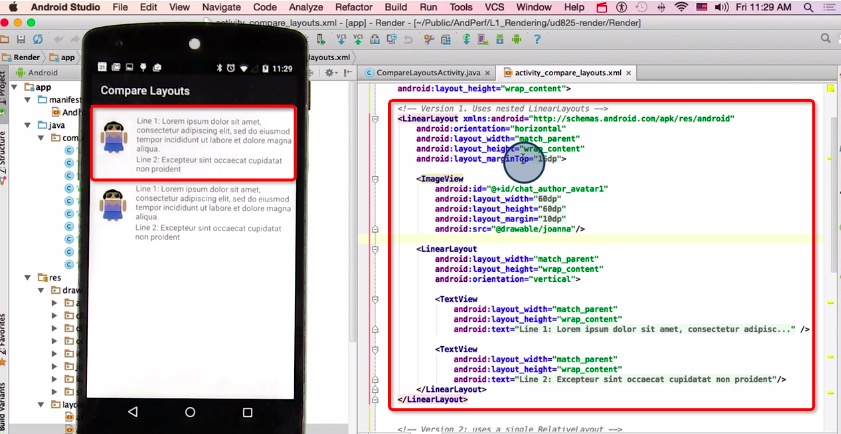 提升布局性能的关键点是尽量保持布局层级的扁平化,避免出现重复的嵌套布局。例如下面的例子,有2行显示相同内容的视图,分别用两种不同的写法来实现,他们有着不同的层级。