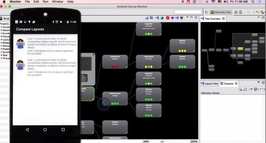Hierarchy Viewer可以很直接的呈现布局的层次关系,视图组件的各种属性。 我们可以通过红,黄,绿三种不同的颜色来区分布局的Measure,Layout,Executive的相对性能表现如何。