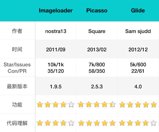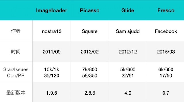 鉴于 Fresco 还没发布正式的 1.0 版本,同时一直没太多时间熟悉 Fresco 源码,后面对比不包括 Fresco,以后有时间再加入对比。