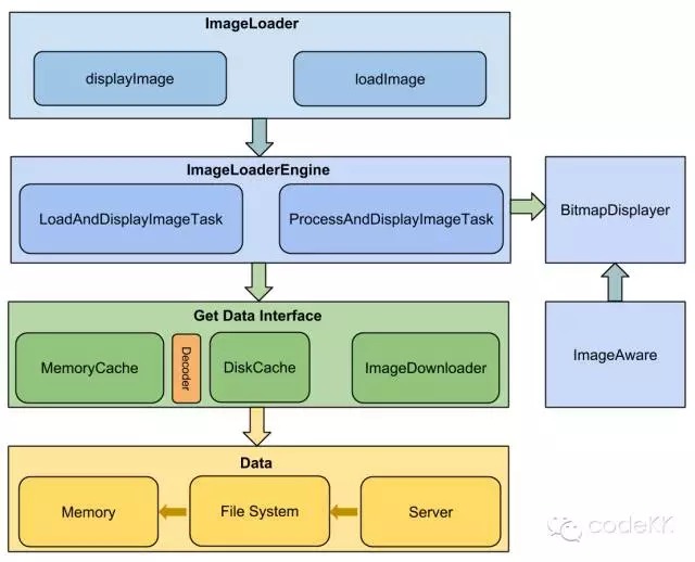 简单的讲就是 ImageLoader 收到加载及显示图片的任务,并将它交给 ImageLoaderEngine,ImageLoaderEngine 分发任务到具体线程池去执行,任务通过 Cache 及 ImageDownloader 获取图片,中间可能经过 BitmapProcessor 和 ImageDecoder 处理,最终转换为Bitmap 交给 BitmapDisplayer 在 ImageAware 中显示。