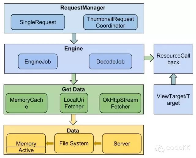 简单的讲就是 Glide 收到加载及显示资源的任务,创建 Request 并将它交给RequestManager,Request 启动 Engine 去数据源获取资源(通过 Fetcher ),获取到后 Transformation 处理后交给 Target。
