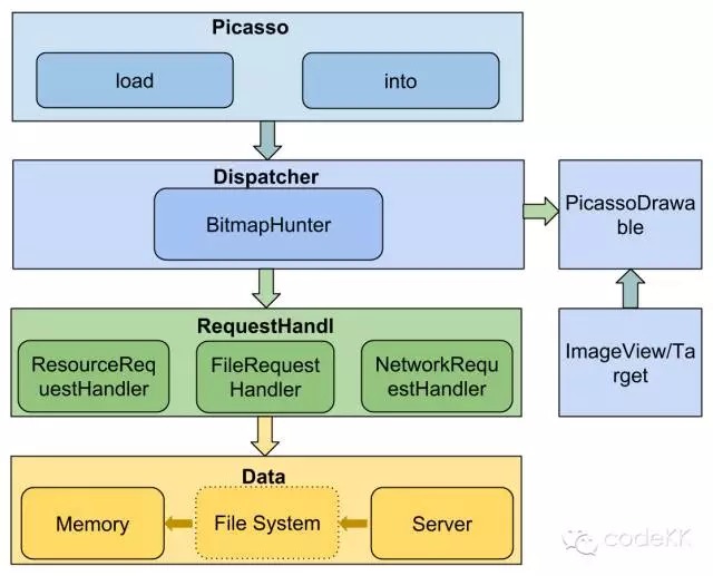 简单的讲就是 Picasso 收到加载及显示图片的任务,创建 Request 并将它交给 Dispatcher,Dispatcher 分发任务到具体 RequestHandler,任务通过 MemoryCache 及 Handler(数据获取接口) 获取图片,图片获取成功后通过 PicassoDrawable 显示到 Target 中。