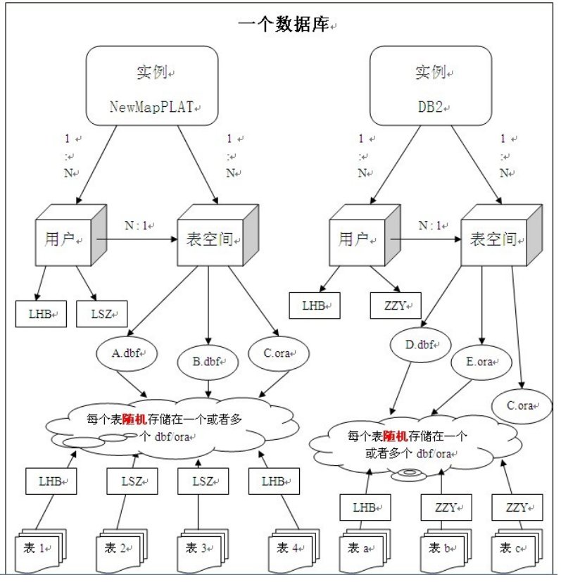 注: 表的数据,是有用户放入某一个表空间的,而这个表空间会随机把这些表数据放到一个或者多个数据文件中。