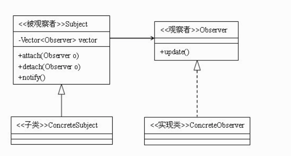 - 定义:表示的是一种一对多的关系。当被观察者类A的属性aa发生了改变,就会主动去通知观察类B、C、D,这样观察类们的状态就会及时的被更新了。