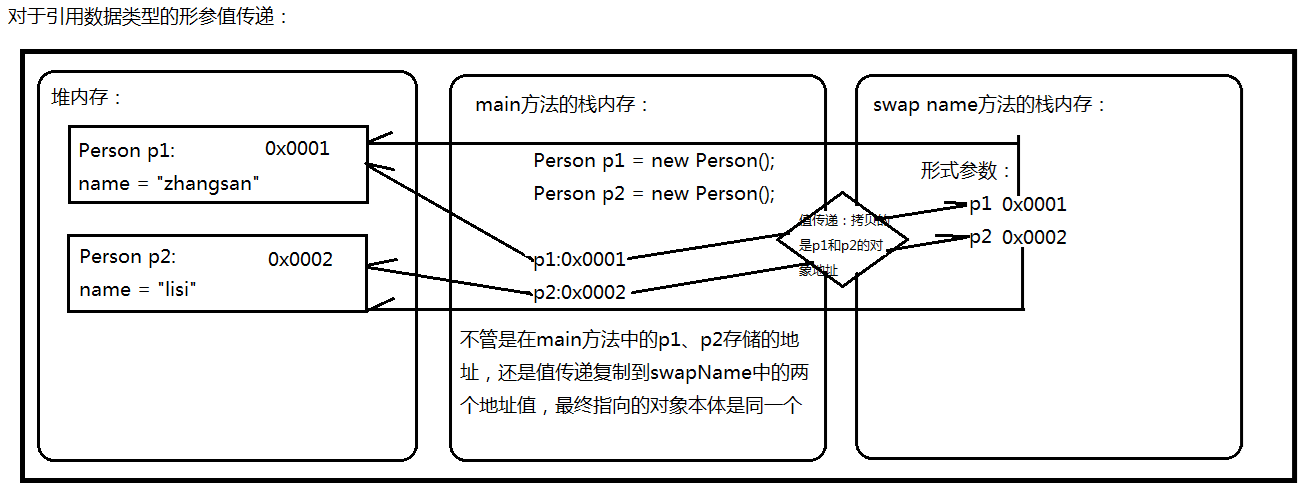 对于引用数据类型:拷贝的是引用变量中存储的对象本体的地址,实参将地址拷贝给形参,实参和形参实际上指向的对象本体其实是同一个,其中一个对这个地址所在的对象本体进行修改,大家都能看得见