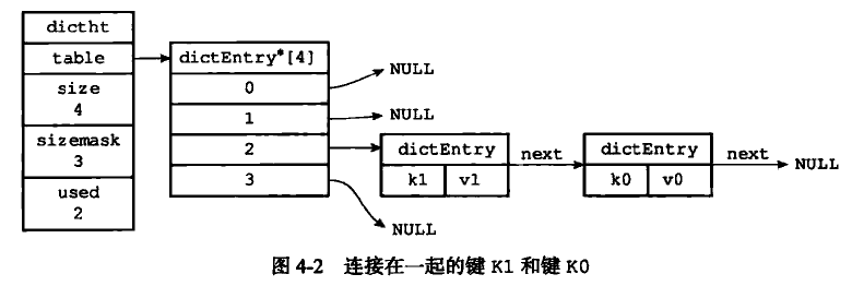 下图通过next指针,将两个索引值相同(索引是2)的键k1和k0连接在一起。