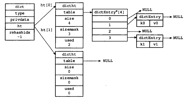 ht属性是一个包含两个项的数组,数组中的每个项都是一个dictht哈希表, 一般情况下,字典只使用ht[0] 哈希表, ht[1]哈希表只会对ht[0] 哈希表进行rehash时使用。另一个和rehash有关的属性是rehashidx,它记录了rehash目前的进度,如果目前没有进行rehash,值为-1。下面图是一个没有进行rehash的字典。