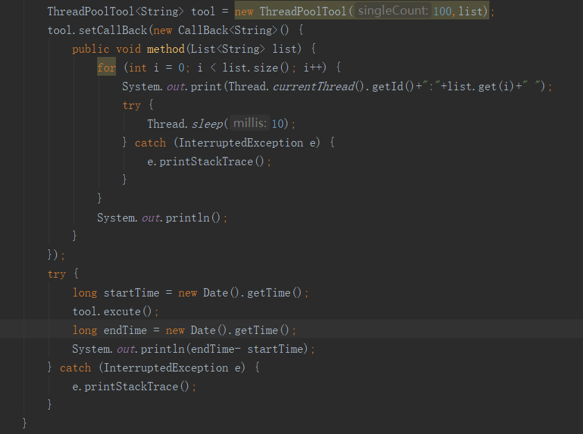 下面使用线程池为size为100的,处理10000条数据总用时1100ms,有没有很神奇,效率接近10倍