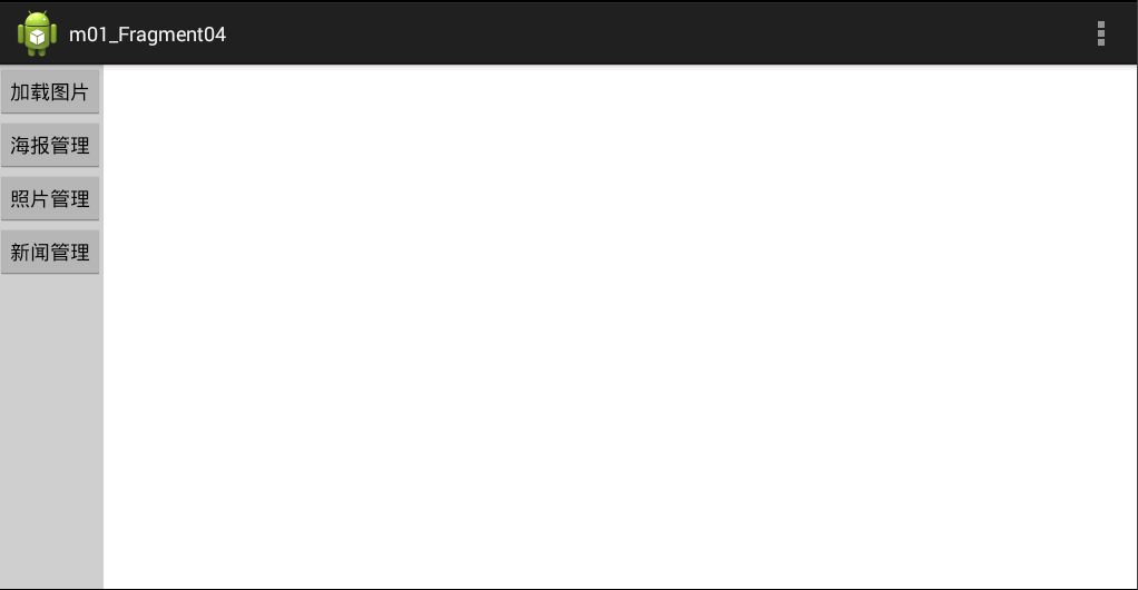 <LinearLayout xmlns:android="http://schemas.android.com/apk/res/android" xmlns:tools="http://schemas.android.com/tools" android:layout_width="match_parent" android:layout_height="match_parent" tools:context=".MainActivity" > <LinearLayout android:id="@+id/left" android:layout_width="wrap_content" android:layout_height="match_parent" android:background="#CCCCCC" android:orientation="vertical" > <Button android:id="@+id/button1" android:layout_width="wrap_content" android:layout_height="wrap_content" android:text="加载图片" /> <Button android:id="@+id/button2" android:layout_width="wrap_content" android:layout_height="wrap_content" android:text="海报管理" /> <Button android:id="@+id/button3" android:layout_width="wrap_content" android:layout_height="wrap_content" android:text="照片管理" /> <Button android:id="@+id/button4" android:layout_width="wrap_content" android:layout_height="wrap_content" android:text="新闻管理" /> </LinearLayout> <LinearLayout android:id="@+id/right" android:layout_width="0dp" android:layout_height="match_parent" android:layout_weight="1" android:orientation="vertical" > </LinearLayout> </LinearLayout>