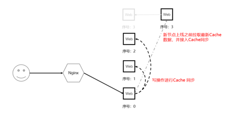 这是最简单粗暴的方式。根据第一节的案例来看,导致问题的原因是节点3没有用户的Session。那么很容易想到,在节点3运行之前把Session相关的Cache数据复制过去呗。并且在多个节点之间持续保证数据的同步,也就是说,每一台节点上都存在每个用户的Session数据。