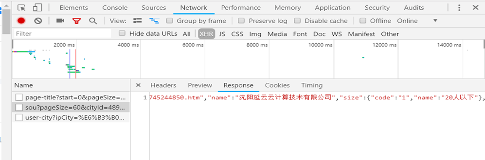 在智联招聘网站中搜索'大数据',跳转到大数据岗位页面,接下来我们点开开发者选项,刷新页面,在Network面板的XHR中发现了这样一个数据包: