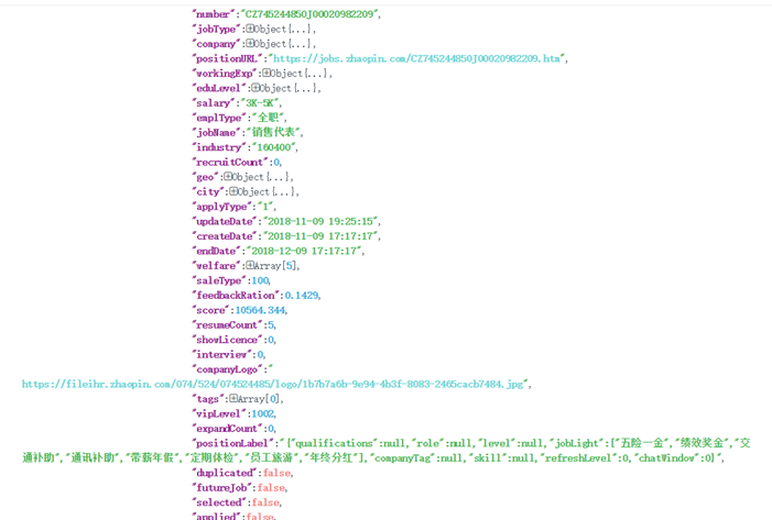 code的值为HTTP的响应码,200表示请求成功。而results数组则是该页面岗位信息的数据。点开第一条数据(results的第一个元素):