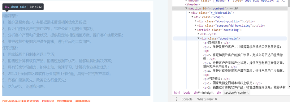 print(title, companyName, place, edu, comment, pay, walfare, workEx, siteUrl)
