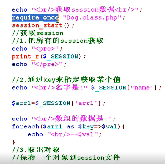 获取Session:1.初始化一个Session数据,session_start();2.使用$_SESSION[ " 键名 " ];(如果我们需要取出一个对象,则需要申明一下类的定义信息);