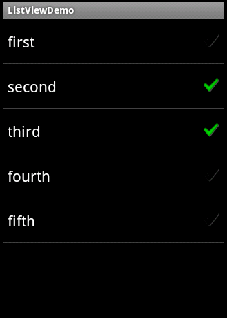 lv.setAdapter(new ArrayAdapter<String>(this, android.R.layout.simple_list_item_checked, strs)); lv.setChoiceMode(ListView.CHOICE_MODE_MULTIPLE);
