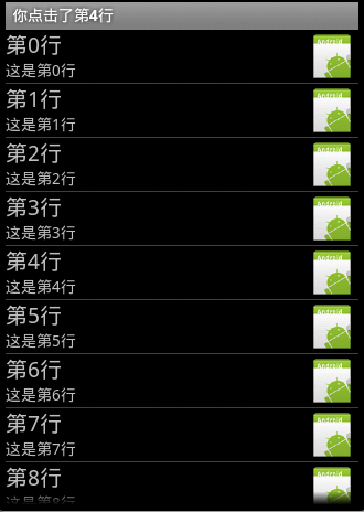 在前面讲到过,ListView的职责除了填充数据外,还要处理用户的操作。通过如下的代码就可以为ListView绑定一个点击监听器,点击后在标题栏显示点击的行数。
