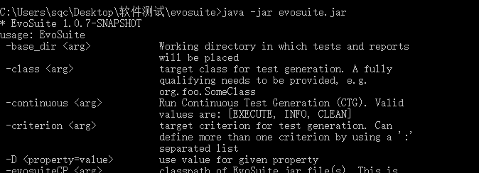 通过java -jar evosuite.jar(evosuite.jar是文件的名称),由于没有赋参数,使用默认参数-help,显示所有的可选参数
