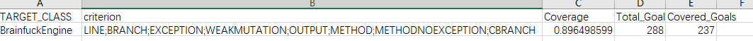 evosuite-report中生成一个statistics.csv的文件,文件中显示目标类、生成测试的标准,覆盖率等参数