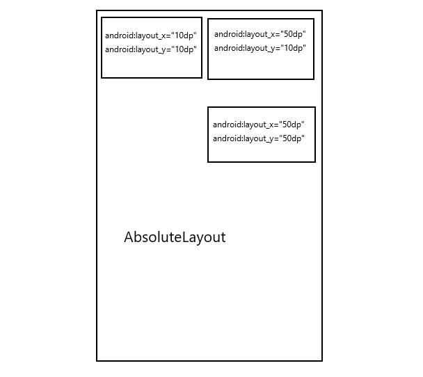 绝对布局中将所有的子元素通过设置android:layout_x 和 android:layout_y属性,将子元素的坐标位置固定下来,即坐标(android:layout_x, android:layout_y) ,屏幕左上角为坐标(0,0),横向往右为正方,纵向往下为正方。实际应用中,因为Android终端一般机型比较多,这种布局用的比较少。