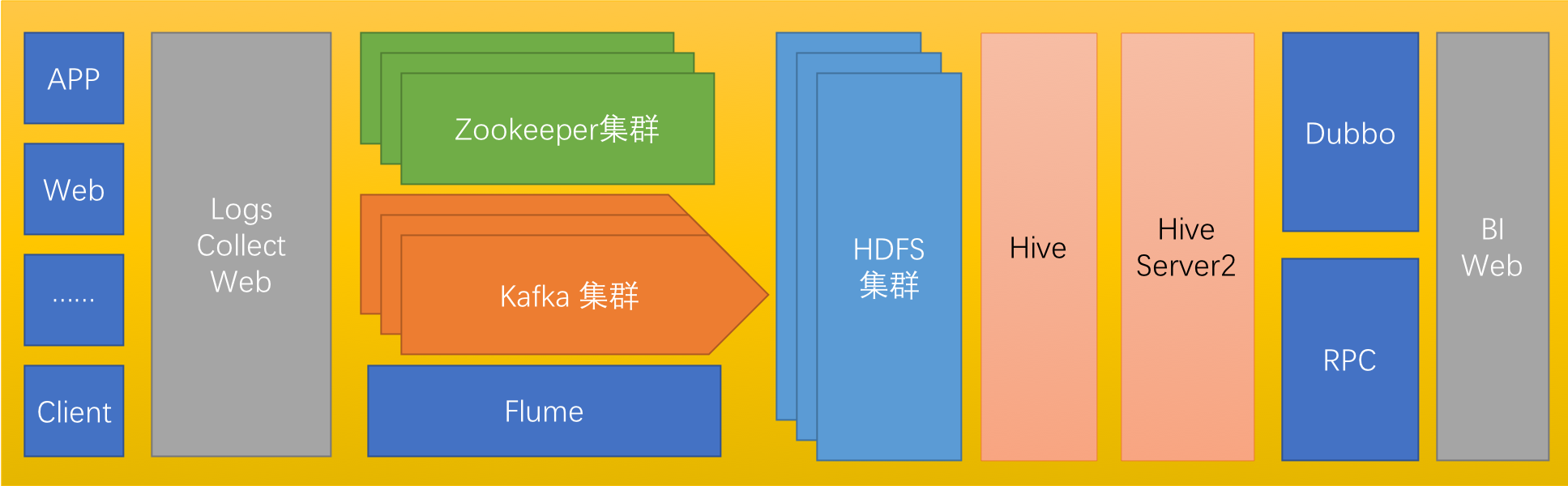 项目主体实现了从各种互联网客户端的日志数据到集中的BI分析系统的全过程,主要包括以下构件: