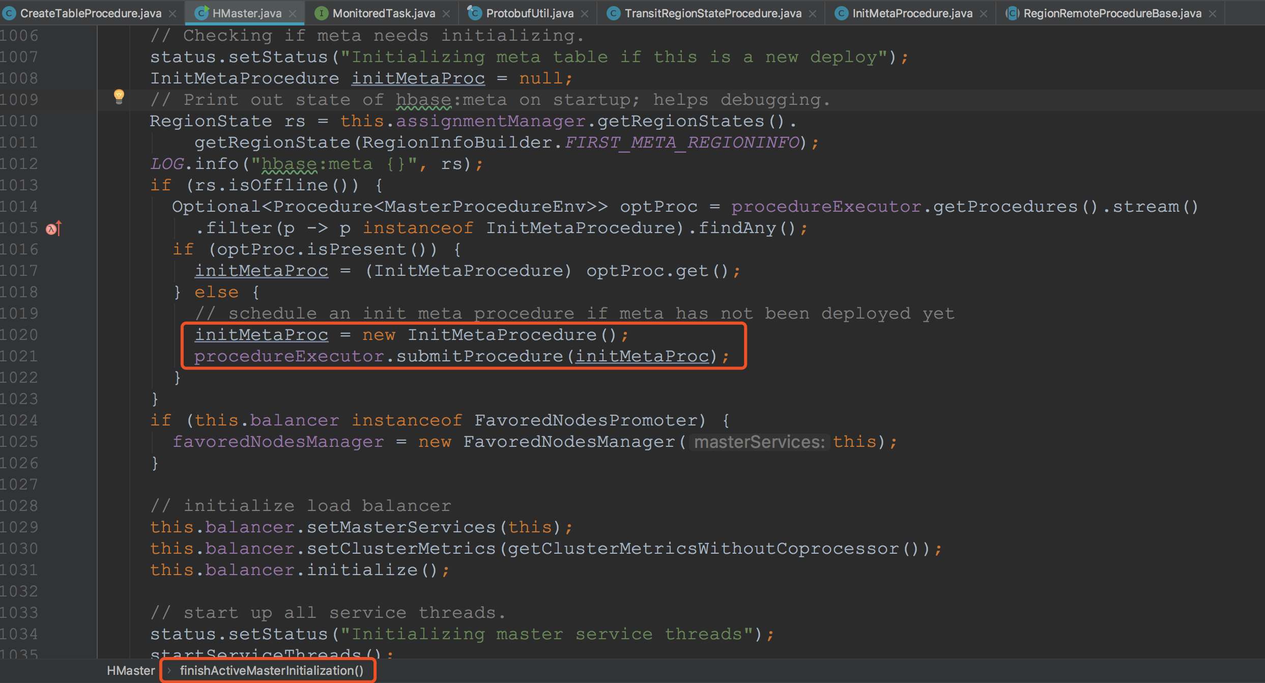 这次,我们主要分析hbase在HMaster的初始化方法finishActiveMasterInitialization中,初始化Meta信息的InitMetaProcedure流程。以最新github分支上的hbase代码而言,对应下图中的: