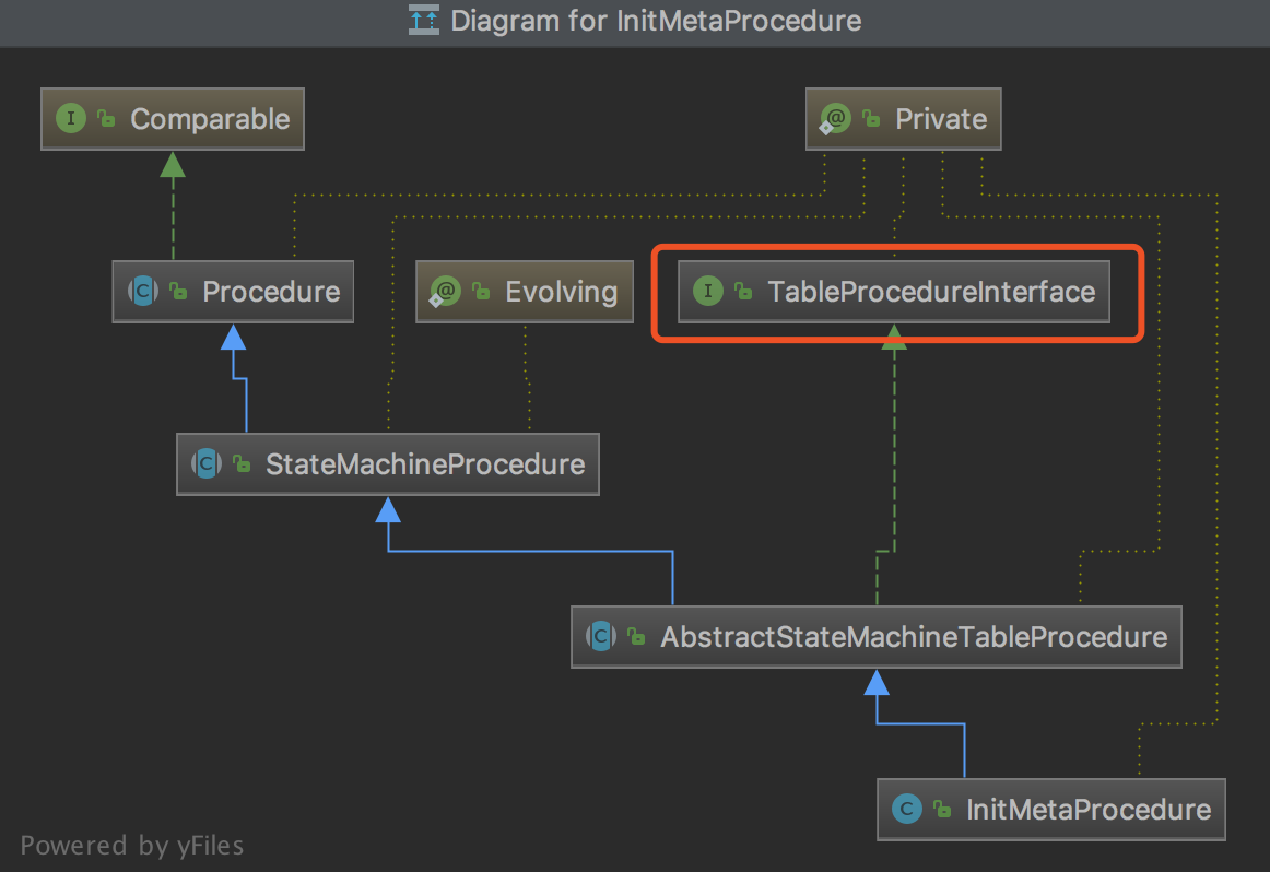 如图所示,在构造了InitMetaProcedure对象之后,ProcedureExecutor将其提交,而后,在ProcedureExecutor.pushProcedure方法中调用scheduler.addBack方法(此时的scheduler为MasterProcedureScheduler)。由于InitMetaProcedure间接实现了TableProcedureInterface接口,如下图所示: