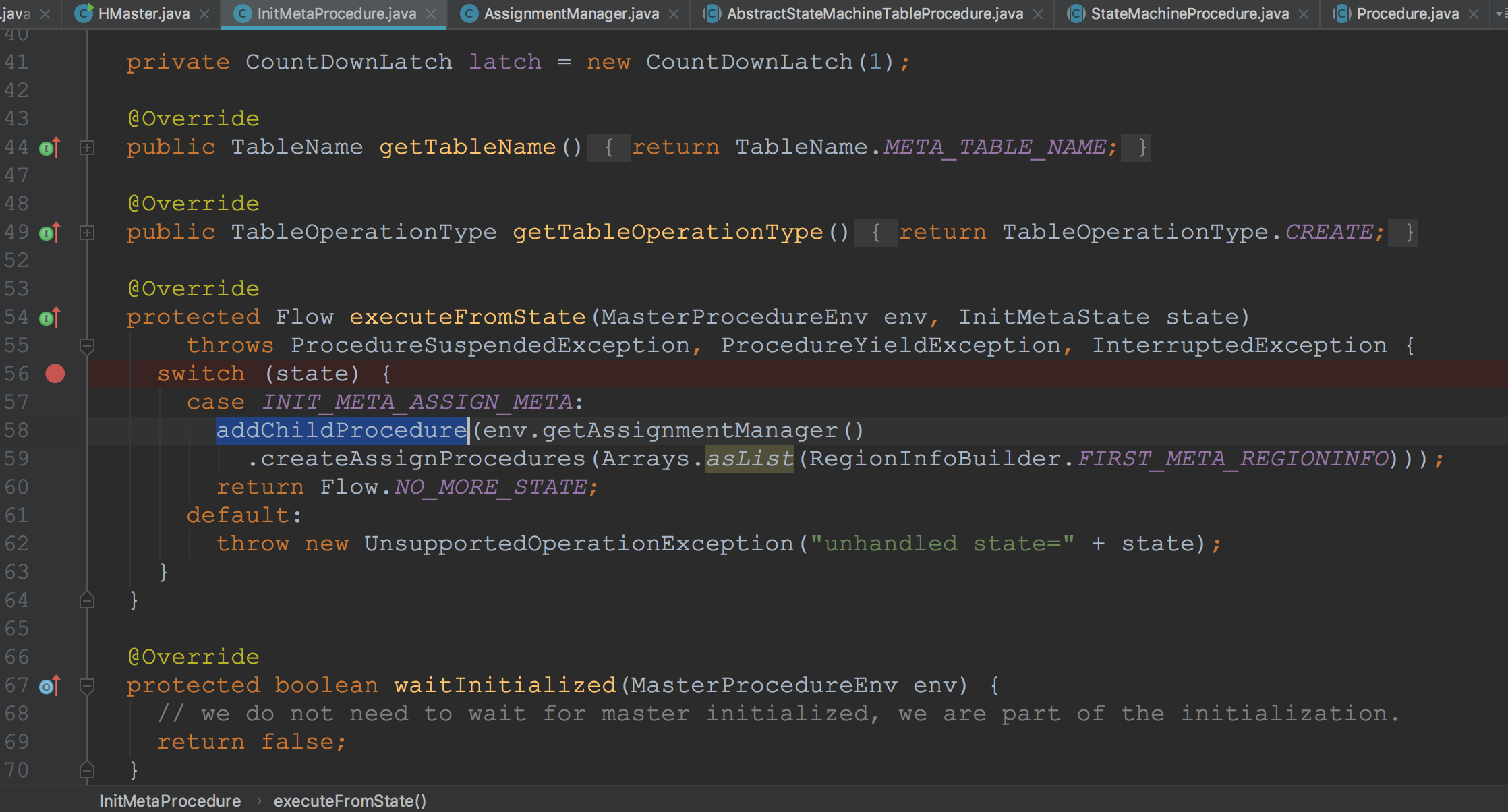 从后续源码中,我们很容易知道,接着依次调用ProcedureExecutor.executeProcedure,procedure.doExecute。特别的,在procedure.doExecute方法中,首先通过其抽象父类Procedure.doExecute,然后调用其抽象父类StateMachineProcedure.execute,最后调用InitMetaProcedure.executeFromState。由于InitMetaProcedure.getInitialState中获得的InitMetaProcedure的初始状态为InitMetaState.INIT_META_ASSIGN_META,因此会调用下面的addChildProcedure方法。