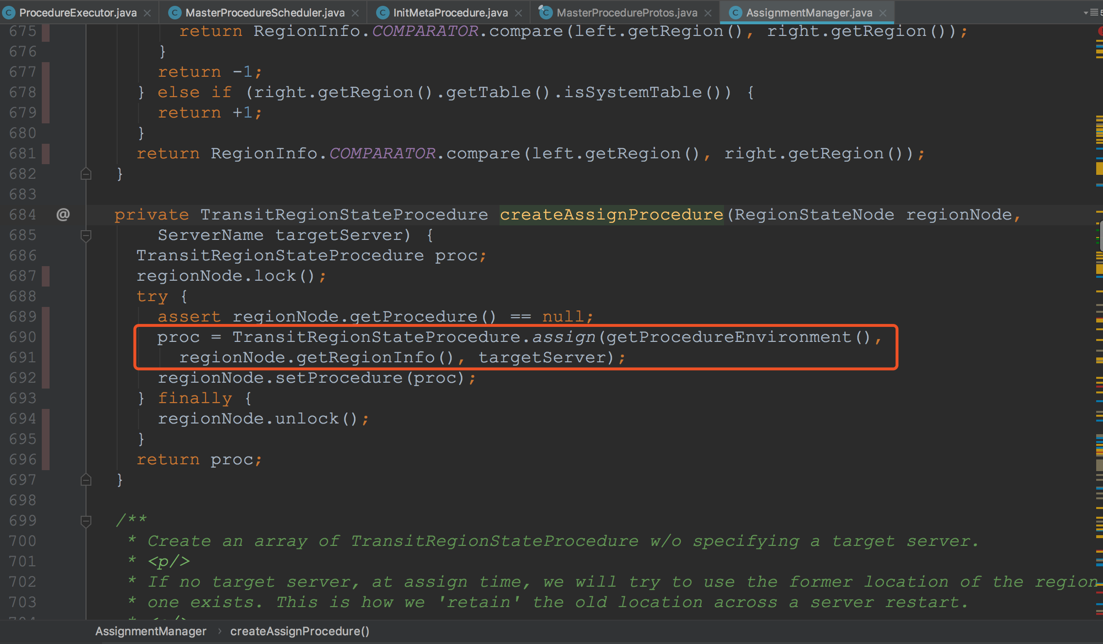 特别的,方法内首先调用AssignmentManager.createAssignProcedures,AssignmentManager.createAssignProcedure,TransitRegionStateProcedure.assign等方法,构建了一个TRSP Procedure。并且初始化TRSP为初始状态为RegionStateTransitionState.REGION_STATE_TRANSITION_GET_ASSIGN_CANDIDATE,