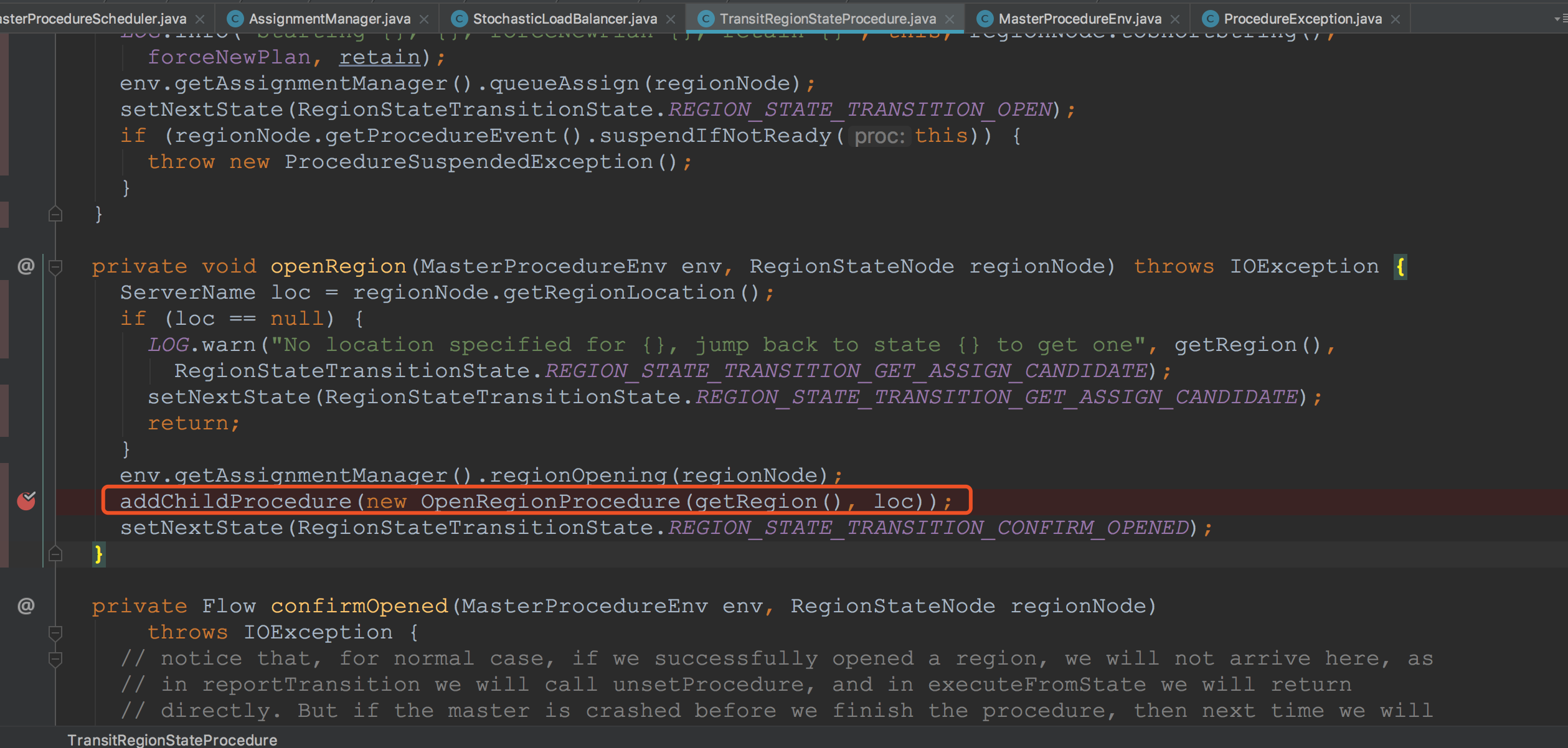 在openRegion方法内调用了AssignmentManager.regionOpening,更新了regionNode为OPENING,而后调用了addChildProcedure(new OpenRegionProcedure(getRegion(), loc)),并且将当前状态设置为REGION_STATE_TRANSITION_CONFIRM_OPENED。