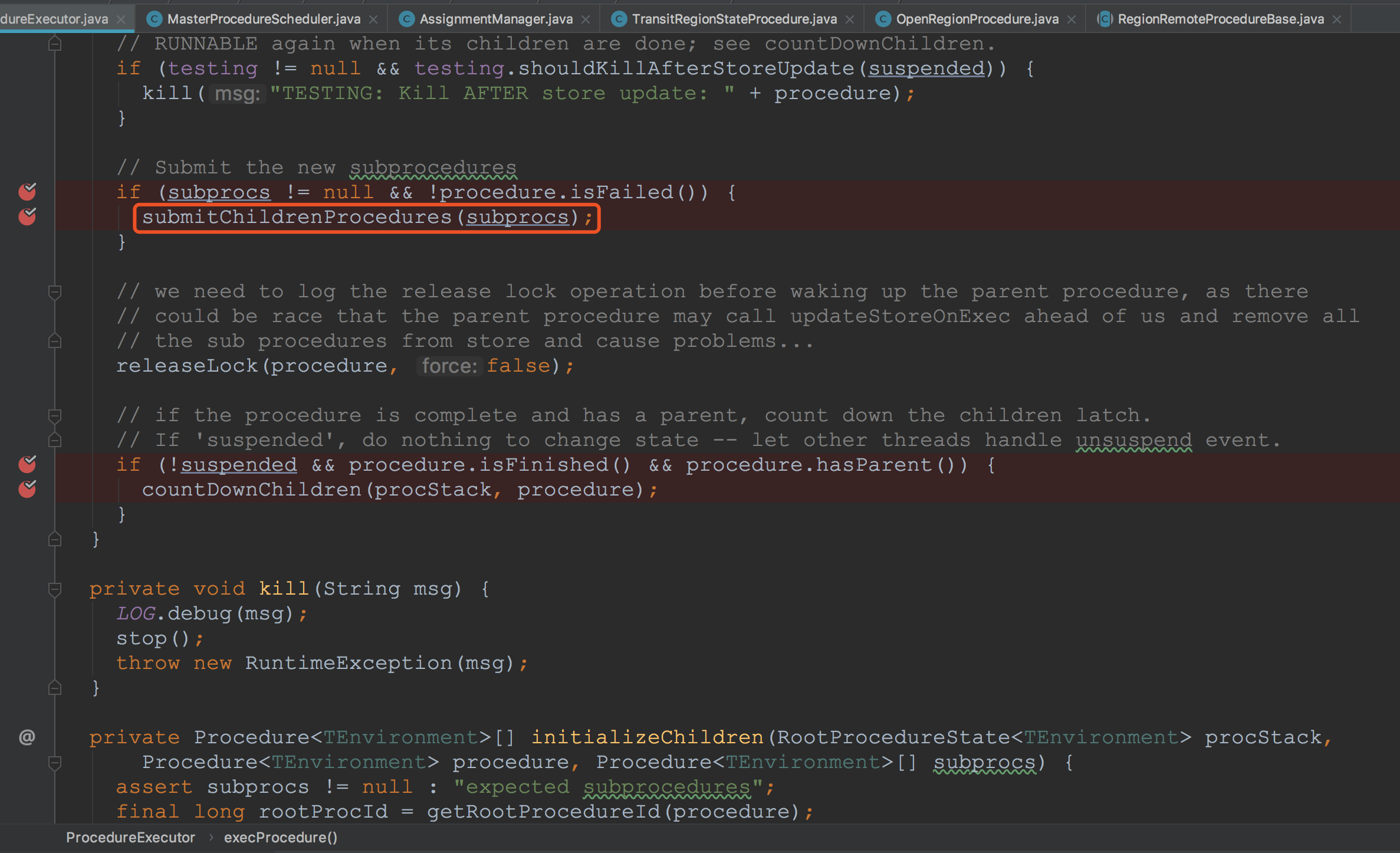 由于上面addChildProcedure方法的调用,因此在该TRSP的subProcList中多了一个OpenRegionProcedure类型的Procedure。紧接着返回到Procedure.execProcedure。
