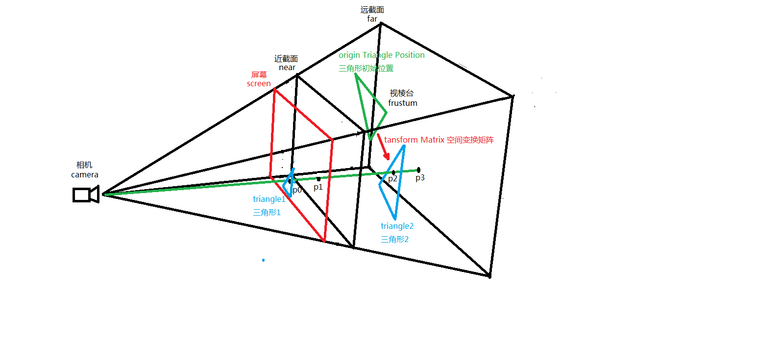我来解释一下上图中的originTriangle,这就是Triangle2三角形第一次绘制在空间中的位置,而Triangle2当前的位置是经过一系列空间变换而来的(这些位置姿态变换大多是由用户鼠标交互产生),变换矩阵就是transformMatrix。这下就引出了本文第一个重点,那就是做raycaster的时候要保证线段碰撞模型的时候一定是模型当前所处的空间位置,即已经做过transformMatrix空间(姿态,位置)变换,否则线段如果和模型之前的初始化位置求交显然没有交点,就拾取失败了。这就是做raycaster要注意的第一个重点,即射线一定要和空间变换后的模型求交。
