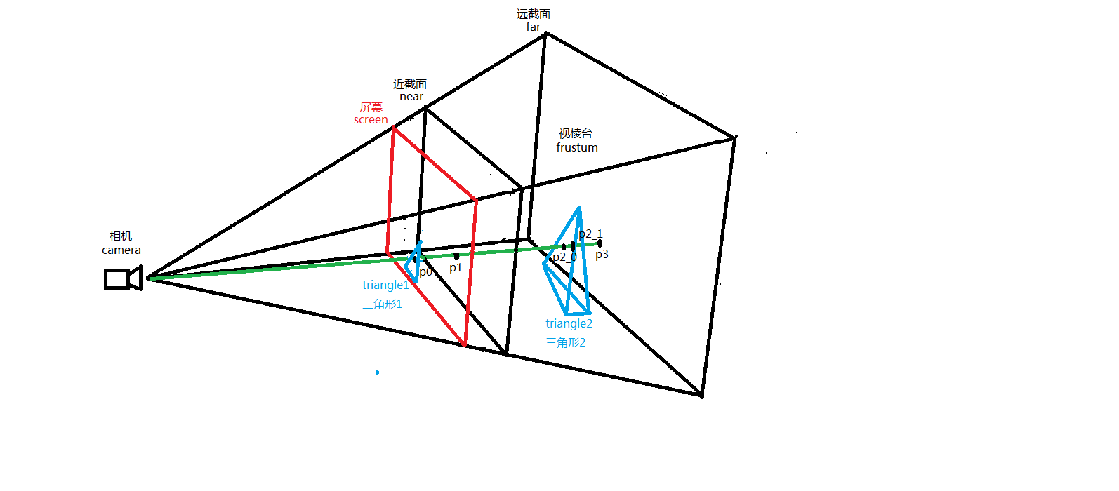 我们看到,射线和模型有2个交点,P2_0和P2_1,分别交四面体的前面于P2_0和交四面体的后面于P2_1。这就是我们要着重关注的本文第二个重点,即raycaster射线拾取模型过程中射线与单个模型有多个交点的问题。处理这个问题其实有很多办法,这里我们采用最简单的方式,就是距离相机(人眼)位置近者胜出的策略。计算交点的算法上一篇文章已经提到,这里不再赘述,但要说明的是,我们计算的每一个面在数据结构中都有自身模型父节点geometry,如果像上图一个四面体的geometry和射线产生了多个面相交,那我们就认为鼠标选中的是该模型geometry离相机(camera)(人眼)最近的交面上的交点。
