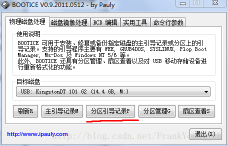 六、用BOOTICE 0.9(我是WIN7 64位系统开始我用的最新版本的貌似不成功,用这个不区分64位的反而成功了),选分区引导,选第2个GRUB4DOS,点安装,弹出的框框GRLDR默认不要动点确定,就行了