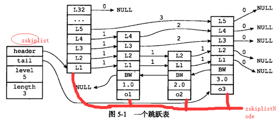 (2) tail : 指向跳跃表的表尾节点。这里为第四个zskiplistNode。