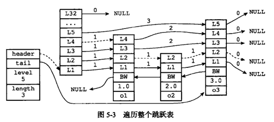 如上图所示: 遍历是程序首先访问跳跃表的第一个节点(表头),然后从第四层(L4)的前进指针移动到表中的第二个节点。在第二个节点时,程序沿着第二层(L2)的前进指针移动到表中的第三个节点。在第三个节点时,程序同样沿着第二层(L2)的前进指针移动到表中的第四个节点。当程序再次沿着第四个节点前进指针移动时,遇到null,程序知道这时已经到达了跳跃表的表尾,于是结束这次遍历。