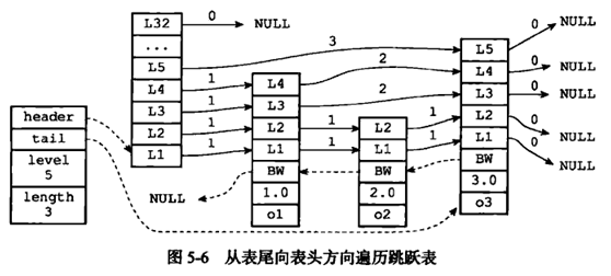 (2) 后退(backward)指针: 节点中用BW字样标记节点的后退指针,后退指针在程序从表尾向表头遍历时使用。