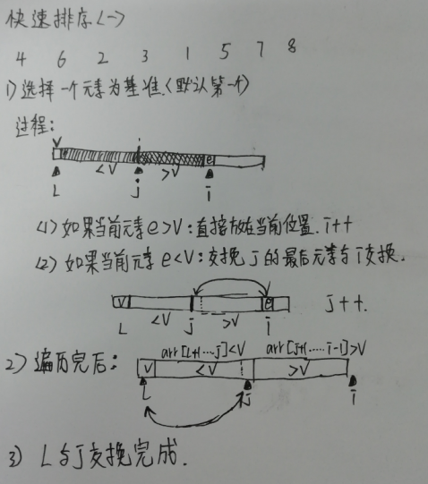 1 #include <iostream> 2 #include <algorithm> 3 #include <ctime> 4 #include "SortTestHelper.h" 5 #include "MergeSort.h" 6 #include "InsertionSort.h" 7 using namespace std; 8 // 对arr[l...r]部分进行partition操作 9 // 返回p, 使得arr[l...p-1] < arr[p] ; arr[p+1...r] > arr[p]10 template <typename T>11 int _partition(T arr[], int l, int r){12 // 随机在arr[l...r]的范围中, 选择一个数值作为标定点pivot13 swap( arr[l] , arr[rand()%(r-l+1)+l] );14 T v = arr[l];15 int j = l;16 for( int i = l + 1 ; i <= r ; i ++ )17 if( arr[i] < v ){18 j ++;19 swap( arr[j] , arr[i] );20 }21 swap( arr[l] , arr[j]);22 return j;23 }24 // 对arr[l...r]部分进行快速排序25 template <typename T>26 void _quickSort(T arr[], int l, int r){27 // 对于小规模数组, 使用插入排序进行优化28 if( r - l <= 15 ){29 insertionSort(arr,l,r);30 return;31 }32 int p = _partition(arr, l, r);33 _quickSort(arr, l, p-1 );34 _quickSort(arr, p+1, r);35 }36 template <typename T>37 void quickSort(T arr[], int n){38 srand(time(NULL));39 _quickSort(arr, 0, n-1);40 }41 // 比较Merge Sort和Quick Sort两种排序算法的性能效率42 int main() {43 int n = 100000;44 // 测试1 一般性测试(随机数) 45 cout<<"Test for random array, size = "<<n<<", random range [0, "<<n<<"]"<<endl;46 int* arr1 = SortTestHelper::generateRandomArray(n,0,n);47 int* arr2 = SortTestHelper::copyIntArray(arr1,n);48 SortTestHelper::testSort("Merge Sort", mergeSort, arr1, n);49 SortTestHelper::testSort("Quick Sort", quickSort, arr2, n);50 delete[] arr1;51 delete[] arr2;52 cout<<endl;53 // 测试2 测试近乎有序的数组54 // 加入了随机选择标定点的步骤后, 我们的快速排序可以轻松处理近乎有序的数组55 // 但是对于近乎有序的数组, 其效率比优化后的归并排序要低, 但完全再容忍范围里56 int swapTimes = 100;57 cout<<"Test for nearly ordered array, size = "<<n<<", swap time = "<<swapTimes<<endl;58 arr1 = SortTestHelper::generateNearlyOrderedArray(n,swapTimes);59 arr2 = SortTestHelper::copyIntArray(arr1, n);60 SortTestHelper::testSort("Merge Sort", mergeSort, arr1, n);61 SortTestHelper::testSort("Quick Sort", quickSort, arr2, n);62 delete[] arr1;63 delete[] arr2;64 cout<<endl;65 // 测试3 测试存在包含大量相同元素的数组66 // 但此时, 对于含有大量相同元素的数组, 我们的快速排序算法再次退化成了O(n^2)级别的算法67 cout<<"Test for random array, size = "<<n<<", random range [0,10]"<<endl;68 arr1 = SortTestHelper::generateRandomArray(n,0,10);69 arr2 = SortTestHelper::copyIntArray(arr1, n);70 SortTestHelper::testSort("Merge Sort", mergeSort, arr1, n);71 SortTestHelper::testSort("Quick Sort", quickSort, arr2, n);72 delete[] arr1;73 delete[] arr2;74 return 0;75 }图解单路快排: