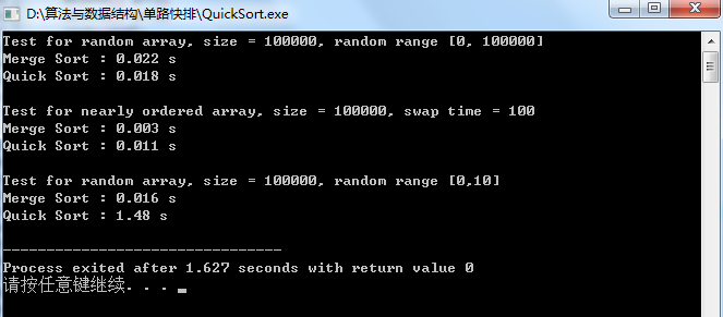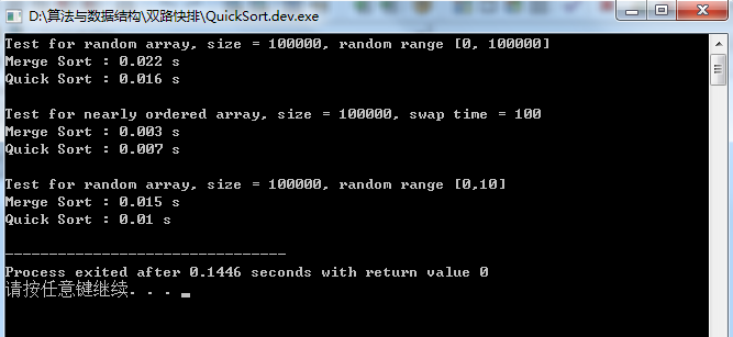 63 int swapTimes = 100;64 cout<<"Test for nearly ordered array, size = "<<n<<", swap time = "<<swapTimes<<endl;65 arr1 = SortTestHelper::generateNearlyOrderedArray(n,swapTimes);66 arr2 = SortTestHelper::copyIntArray(arr1, n);67 arr3 = SortTestHelper::copyIntArray(arr1, n);68 SortTestHelper::testSort("Merge Sort", mergeSort, arr1, n);69 SortTestHelper::testSort("Quick Sort", quickSort, arr2, n);70 SortTestHelper::testSort("Quick Sort 3 Ways", quickSort3Ways, arr3, n);71 delete[] arr1;72 delete[] arr2;73 delete[] arr3;74 cout<<endl;75 // 测试3 测试存在包含大量相同元素的数组76 cout<<"测试存在包含大量相同元素的数组"<<endl;