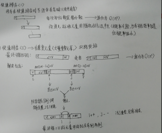 1 #include <iostream> 2 #include <algorithm> 3 #include <ctime> 4 #include "SortTestHelper.h" 5 #include "MergeSort.h" 6 #include "InsertionSort.h" 7 using namespace std; 8 // 对arr[l...r]部分进行partition操作 9 // 返回p, 使得arr[l...p-1] < arr[p] ; arr[p+1...r] > arr[p] 10 template <typename T> 11 int _partition(T arr[], int l, int r){ 12 // 随机在arr[l...r]的范围中, 选择一个数值作为标定点pivot 13 swap( arr[l] , arr[rand()%(r-l+1)+l] ); 14 T v = arr[l]; 15 int j = l; 16 for( int i = l + 1 ; i <= r ; i ++ ) 17 if( arr[i] < v ){ 18 j ++; 19 swap( arr[j] , arr[i] ); 20 } 21 swap( arr[l] , arr[j]); 22 return j; 23 } 24 // 双路快速排序的partition 25 // 返回p, 使得arr[l...p-1] < arr[p] ; arr[p+1...r] > arr[p] 26 template <typename T> 27 int _partition2(T arr[], int l, int r){ 28 // 随机在arr[l...r]的范围中, 选择一个数值作为标定点pivot 29 swap( arr[l] , arr[rand()%(r-l+1)+l] ); 30 T v = arr[l]; 31 // arr[l+1...i) <= v; arr(j...r] >= v 32 int i = l+1, j = r; 33 while( true ){ 34 // 注意这里的边界, arr[i] < v, 不能是arr[i] <= v 35 while( i <= r && arr[i] < v ) 36 i ++; 37 // 注意这里的边界, arr[j] > v, 不能是arr[j] >= v 38 while( j >= l+1 && arr[j] > v ) 39 j --; 40 if( i > j ) 41 break; 42 swap( arr[i] , arr[j] ); 43 i ++; 44 j --; 45 } 46 swap( arr[l] , arr[j]); 47 return j; 48 } 49 // 对arr[l...r]部分进行快速排序 50 template <typename T> 51 void _quickSort(T arr[], int l, int r){ 52 // 对于小规模数组, 使用插入排序进行优化 53 if( r - l <= 15 ){ 54 insertionSort(arr,l,r); 55 return; 56 } 57 // 调用双路快速排序的partition 58 int p = _partition2(arr, l, r); 59 _quickSort(arr, l, p-1 ); 60 _quickSort(arr, p+1, r); 61 } 62 template <typename T> 63 void quickSort(T arr[], int n){ 64 srand(time(NULL)); 65 _quickSort(arr, 0, n-1); 66 } 67 // 比较Merge Sort和双路快速排序两种排序算法的性能效率 68 int main() { 69 int n = 100000; 70 // 测试1 一般性测试 71 cout<<"Test for random array, size = "<<n<<", random range [0, "<<n<<"]"<<endl; 72 int* arr1 = SortTestHelper::generateRandomArray(n,0,n); 73 int* arr2 = SortTestHelper::copyIntArray(arr1,n); 74 SortTestHelper::testSort("Merge Sort", mergeSort, arr1, n); 75 SortTestHelper::testSort("Quick Sort", quickSort, arr2, n); 76 delete[] arr1; 77 delete[] arr2; 78 cout<<endl; 79 // 测试2 测试近乎有序的数组 80 // 双路快速排序算法也可以轻松处理近乎有序的数组 81 int swapTimes = 100; 82 cout<<"Test for nearly ordered array, size = "<<n<<", swap time = "<<swapTimes<<endl; 83 arr1 = SortTestHelper::generateNearlyOrderedArray(n,swapTimes); 84 arr2 = SortTestHelper::copyIntArray(arr1, n); 85 SortTestHelper::testSort("Merge Sort", mergeSort, arr1, n); 86 SortTestHelper::testSort("Quick Sort", quickSort, arr2, n); 87 delete[] arr1; 88 delete[] arr2; 89 cout<<endl; 90 // 测试3 测试存在包含大量相同元素的数组 91 // 使用双快速排序后, 我们的快速排序算法可以轻松的处理包含大量元素的数组 92 cout<<"Test for random array, size = "<<n<<", random range [0,10]"<<endl; 93 arr1 = SortTestHelper::generateRandomArray(n,0,10); 94 arr2 = SortTestHelper::copyIntArray(arr1, n); 95 SortTestHelper::testSort("Merge Sort", mergeSort, arr1, n); 96 SortTestHelper::testSort("Quick Sort", quickSort, arr2, n); 97 delete[] arr1; 98 delete[] arr2; 99 return 0;100 }图解双路快排: