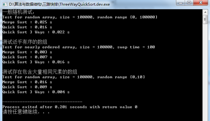 可见优化后的双路快排在大量重复元素的数组测试中速度提升了近乎200倍,接下来让我们在来看看最棒的三路快排: